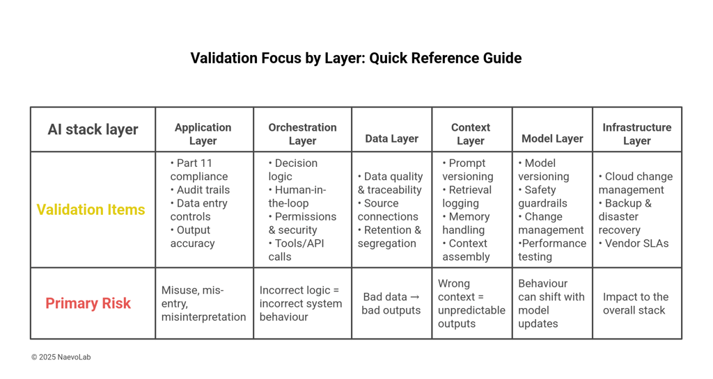 From a validation perspective, this layer focuses on availability, reliability, security controls, backup and recovery, change management, and supplier assurance. Cloud updates or misconfigurations can impact the entire AI stack.